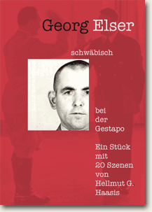 GEORG ELSER SCHWÄBISCH BEI DER GESTAPO ein stück mit 20 Szenen ein neues elser-theaterstück, soeben erschienen beim freiheitsbaum, meinem miniverlag. erste auflage nur 100 stück, bibliophile edition, handkoloriert, signiert und datiert. ISBN 3-922589-31-6. - 12 euro. elser spricht hier erstmals schwäbisch im theater, bei der gestapo, nach seinem text, nicht nach dem der protokollanten. ein versuch geeignet für eine szenische lesung. krönung: die letzte, eine surrealistische szene, in der selbst ministerpräsident oettinger auftritt. szenische lesung mit bildern (power-point). anfragen wie bestellungen der edition bei freiheitsbaum, haasis, Tannenstr. 17, 72770 reutlingen, tel. 07121-50.91.73. das stück wird vorgestellt nach seiner intention, der arbeitserfahrung des autors und mit power-point-bildern. einzelne szenen lese ich selbst, andere skizziere ich. dazu ergänzende szenen aus meiner elser-biographie. der theatertext ist gut lesbar und noch käuflich. |